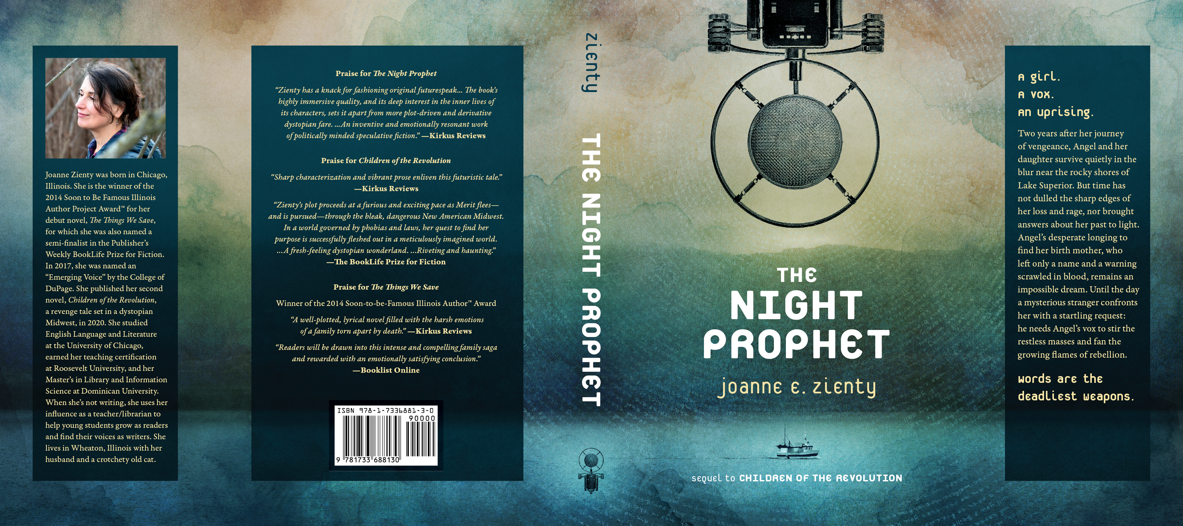 The first two novels in a planned trilogy, Children of the Revolution (2020) and The Night Prophet (2024) are set in the future American Midwest, a bleak dystopian landscape known as the Protectorate, wrecked by environmental mishandling and governed by a cold, inhumane corporate oligarchy. Designing every aspect of these novels—from the interior text layout and world-building maps to the cover artwork—and preparing the books for publication was a gratifying series of challenges and an invaluable learning process. It has been a true pleasure to partner twice with award-winning author Joanne E. Zienty and help bring her stories to life.