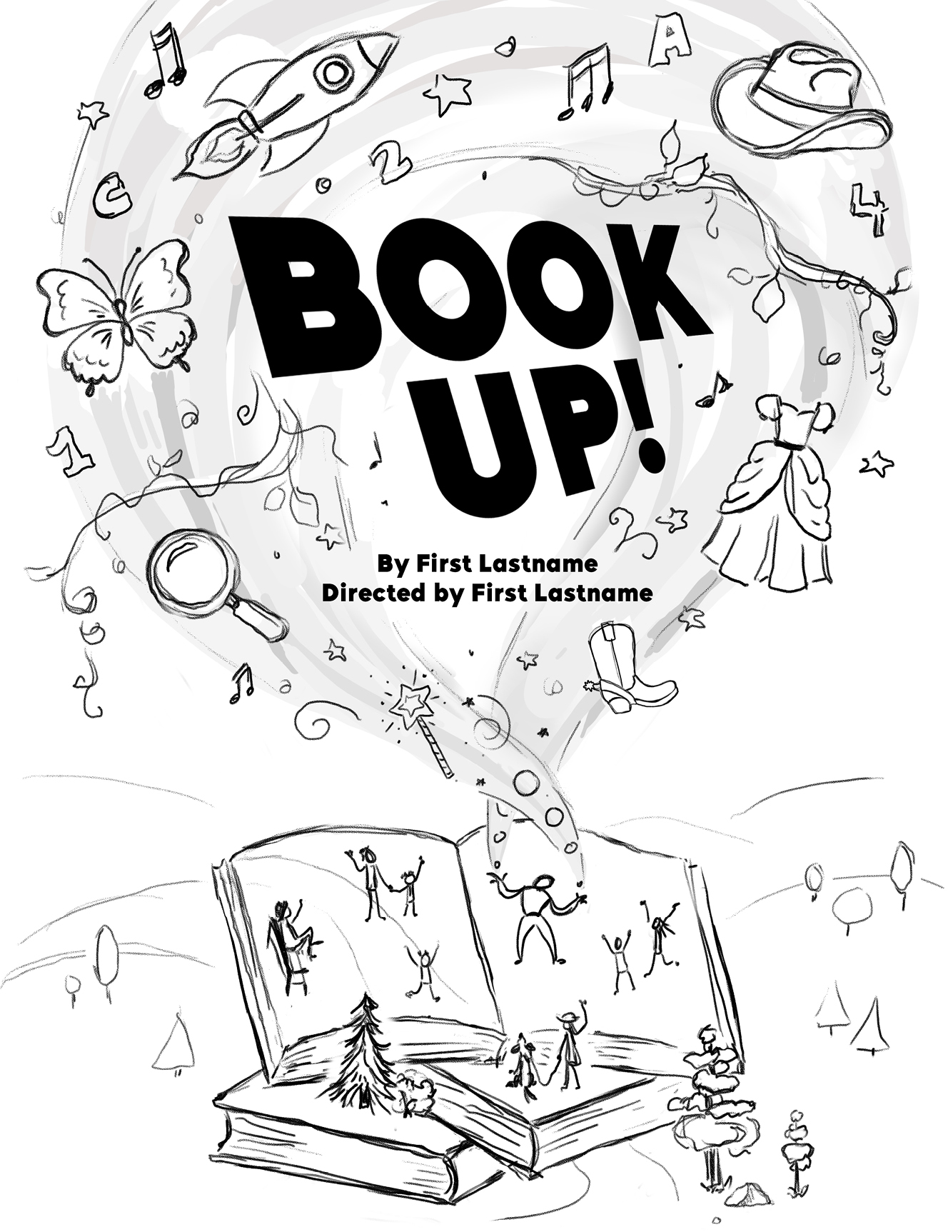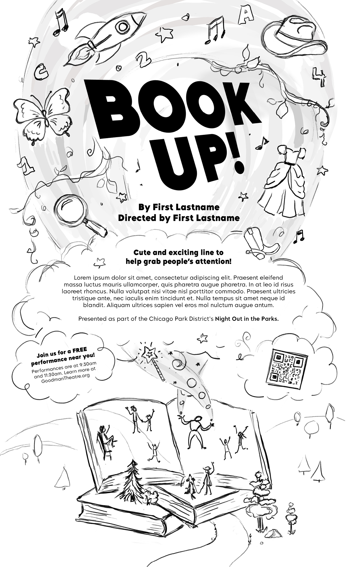 Above: the final illustration and title treatment. With every project, I try to consider many potential applications and give clients as much flexibility as possible, so for this image nearly all the elements—genre symbols, doodles, people, trees, etc—are separate and movable. The Goodman team can freely resize and reconfigure these elements as needed for a wide variety of print and digital marketing materials.
