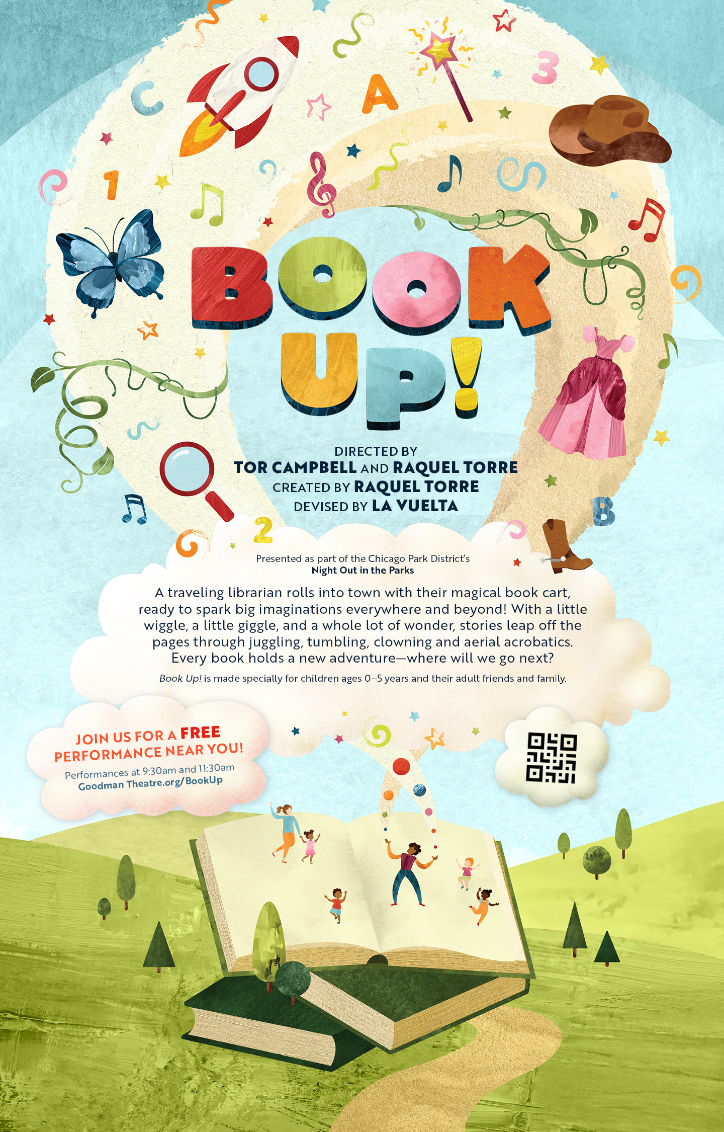 Opening in late summer 2025, Book Up! is a free traveling theater production for young children that will host outdoor performances in public parks across Chicago. The Goodman approached me to design and illustrate the show’s signature artwork in a similar style to that of their 2024 summer children’s show, The Lizard y El Sol.